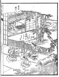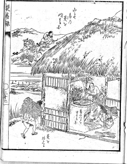 又は湯をたぎらしその中に漬け、ゆですぎざるようざっとゆでてよし。然して後、浅き河に漬け置く事一日一夜にして引き上げて、土間にこも を敷き、その上において上よりこもをたくさん取りかけ、又その上に青 草を切りかけ寝させて三日目の朝こもをめくり取れば、湯気たちて熱くなるなり。