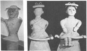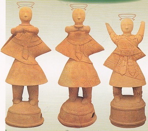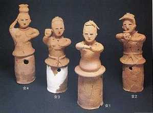 埼玉県深谷市白山2号墳(6世紀前半)からは写真の4体の女性像が出土している。4人ともネックレスをし、両肩に細い手襁をかけたそろいの支度である。中央の女1は、太帯を締めて正座し、手のひらを上下に重ねて前に出しているところから、祭祀を執り行う巫女とみられている。他の3体は、巫女に奉仕する女性で、静水を運んで捧げている。