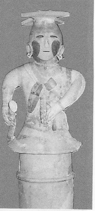 円筒埴輪の初現からおよそ200年経った5世紀中頃、古墳には人物動物埴輪群像が登場する。その中に巫女の埴輪がある。巫女や男巫とされる埴輪は、必ずといって良いほど手襁(たすき)を掛けている。手襁はいずれも細い紐状のものを、両腕に掛け後ろで交差させる形式の物が最も多いが(写真2)、千葉県の木戸前一号古墳出土の女性像のように前で交叉したものもある。