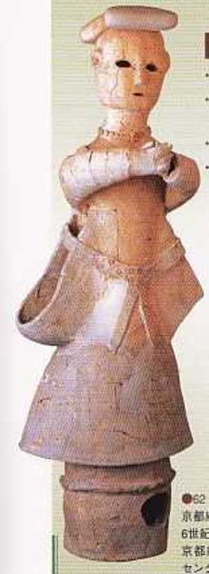 大阪府高槻市今城塚3区(6世紀前半)は、継体天皇の墓と目されている。大王墓にふさわしく、写真の巫女と奉仕する女性は大型で堂々としている。 巫女は、やはり手襁を掛け、その上に祭服をまとい、太い鮮やかな模様の帯を締めている。