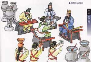 これらを総合して、手襁をかけた巫女が王と祭祀を執り行っている様子が、若狭徹著「はにわの世界」の中にイラスト化されているので紹介したい。